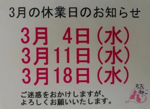 3月4日(水)11日(水)18日(水)は休業日とさせていただきます。